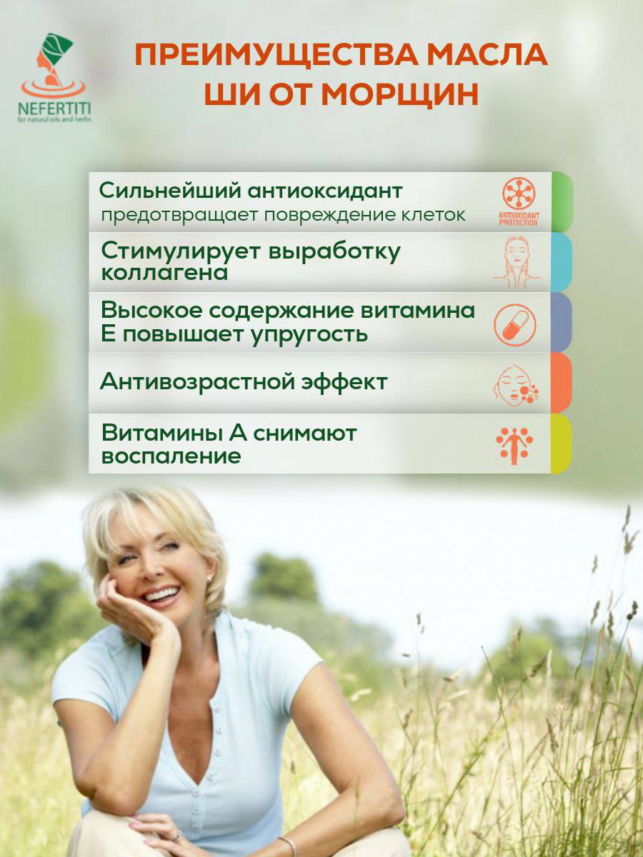 Масло ши извлекается из орехов дерева карите. Масло ши в основном содержит жирные и олеиновые кислоты, а также витамин Е. Это делает его популярным средством для ухода за кожей, поскольку оно увлажняет и защищает кожу. Масло ши глубоко проникает в кожу, и его активные ингредиенты эффективно защищают ее от обезвоживания и образования морщин, великолепно питают ее.