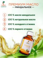 Натуральное миндальное масло – это шелковистое, мягкое, гипоаллергенное и нежное масло, которое можно безопасно использовать для всех типов кожи, в том числе даже для чувствительной детской кожи. При мягком втирании в кожу миндальное масло прекрасно впитывается. Натуральное миндальное масло имеет легкий ореховый запах, который большинство людей находят приятным и расслабляющим, поэтому эфирное масло миндаля именуют одним из лучших базовых масел для массажа. Оно восстанавливает естественную защитную пленку кожи, насыщает ее витаминами, прекрасно увлажняет обезвоженную сухую кожу тела. Природное масло миндаля можно использовать в качестве основного массажного масла, а также вы можете использовать его для обогащения большинства ваших косметических продуктов, начиная с крема и лосьона для лица и тела, и заканчивая средствами по уходу за волосами. Миндальное масло может быть использовано для уменьшения воздействия ультрафиолетовых лучей на кожу, что позволяет уменьшить последствия “фотостарения” кожи. Витамины и минералы, содержащиеся в миндальном масле, укрепляют ломкие ногти, позволяют расти им быстрее, быть сильными и здоровыми. Миндальное масло ценят за способность замедлить процесс старения кожи, повысить ее эластичность, вернуть блеск волосам и ускорить их рост. Масло можно использовать для снятия макияжа. Это одновременно питает ресницы и брови и стимулирует их рост.