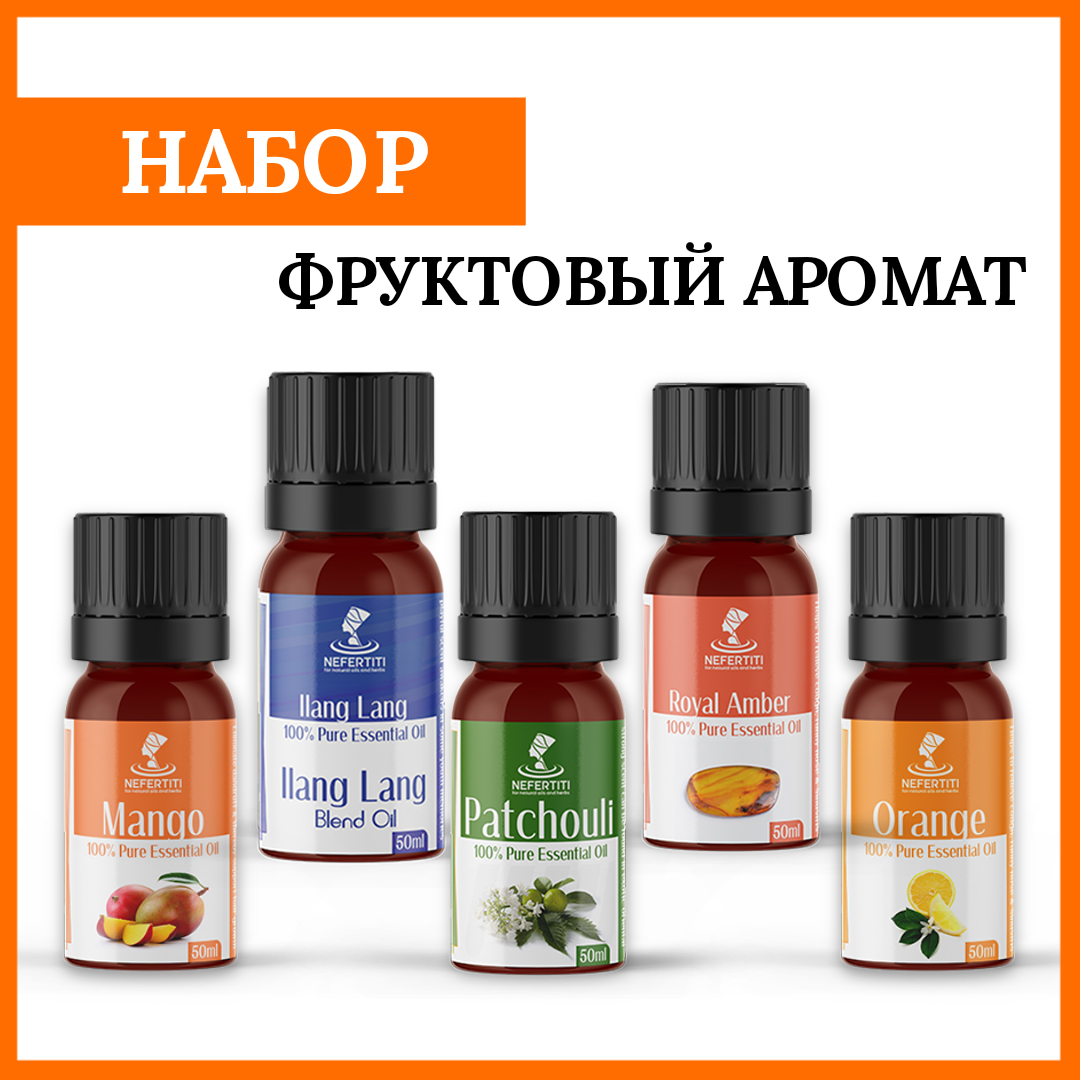 Масло манго — 30 мл Масло иланг-иланг — 50 мл Масло апельсина — 30 мл Масло амбер — 30 мл Масло пачули — 30мл |