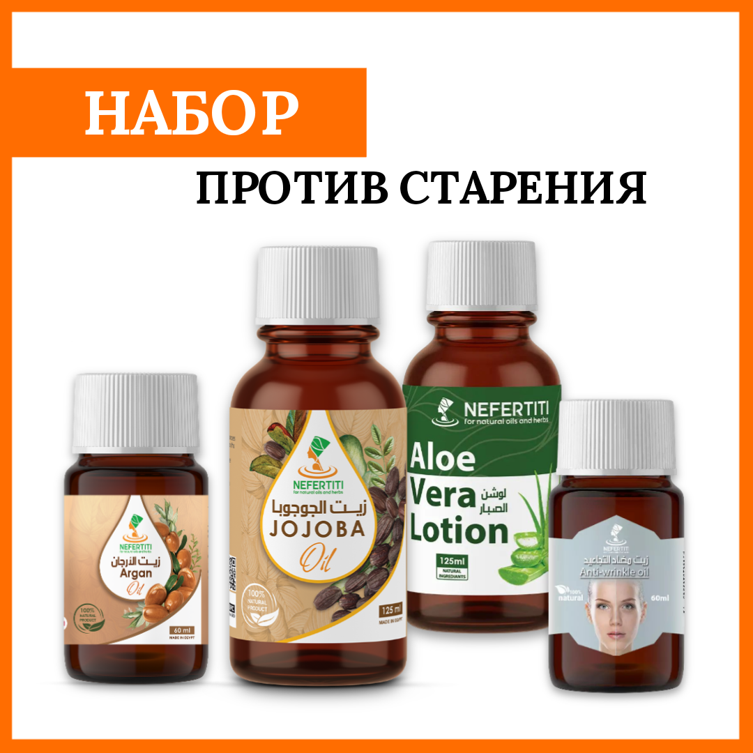 Масло жожоба -125 мл Лосьон Алоэ вера — 125 мл Аргановое масло — 60 мл Смесь масел от морщин — 60 мл |