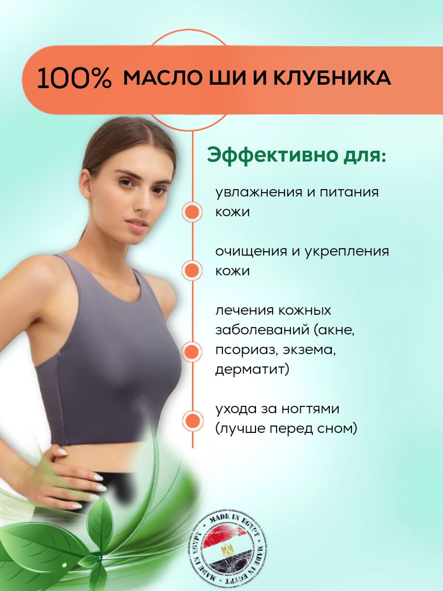 Защитная функция масла ши с клубничным маслом обеспечивает коже естественный барьер против воздействия бактерий и вредных факторов окружающей среды. Мощные увлажняющие свойства делают его антивозрастным продуктом, так как с возрастом кожа активнее теряет влагу и эластичность, и регулярное использование масла ши с клубничным маслом поможет предотвратить это. Клубничное масло обеспечивает коже необходимое увлажнение. Эта смесь эффективна при таких кожных заболеваниях, как акне, псориаз, экзема и дерматит, а также при повреждениях кожи от солнечных ожогов. Восстанавливая эластичность кожи, масло ши с клубничным маслом помогает при растяжках и шрамах. Для использования возьмите немного масла ши с клубничным маслом в ладони, разотрите, а затем нанесите его на кожу.